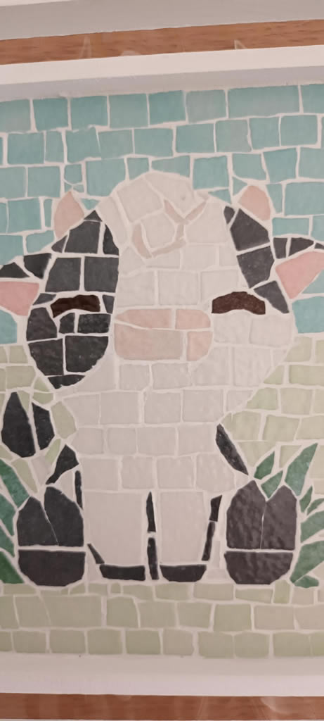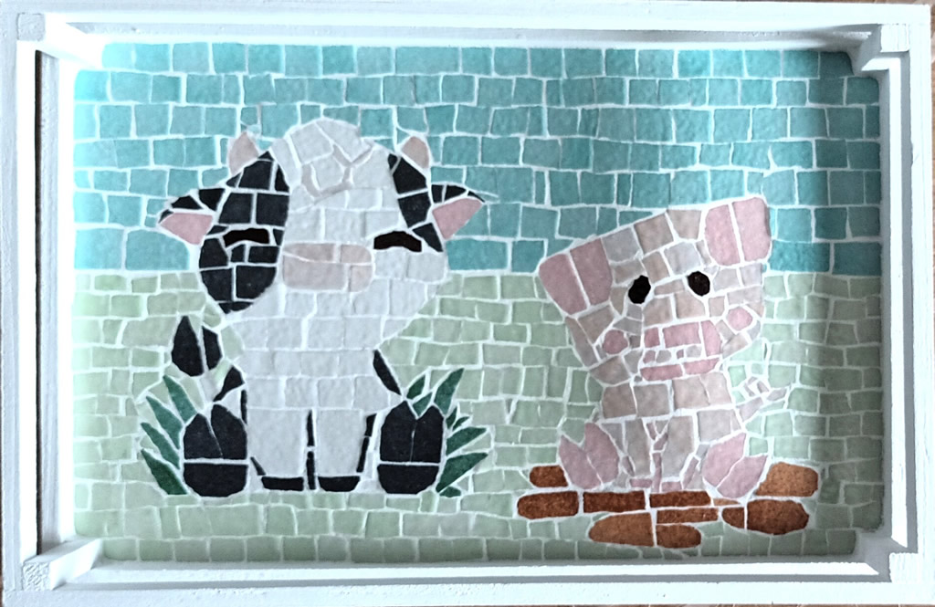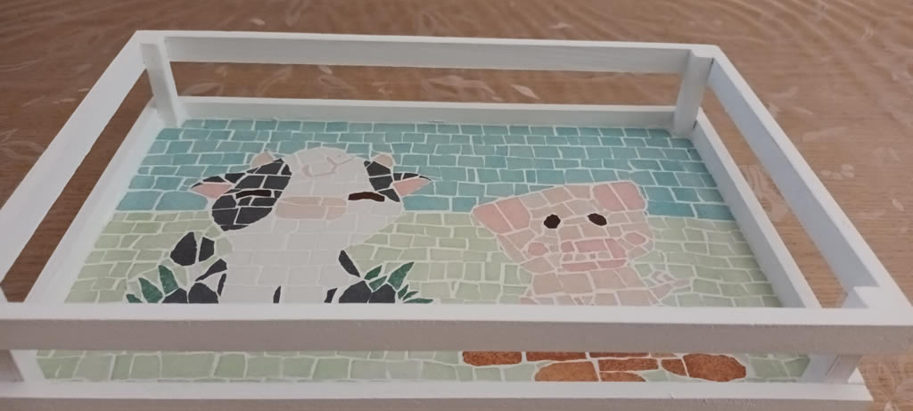 Découvrez ce magnifique plateau en mosaïque représentant une vache et un cochon, une pièce unique pour les amoureux de la ferme. Chaque détail coloré attire le regard, ajoutant une touche artistique et chaleureuse à votre décoration. Un véritable coup de cœur !